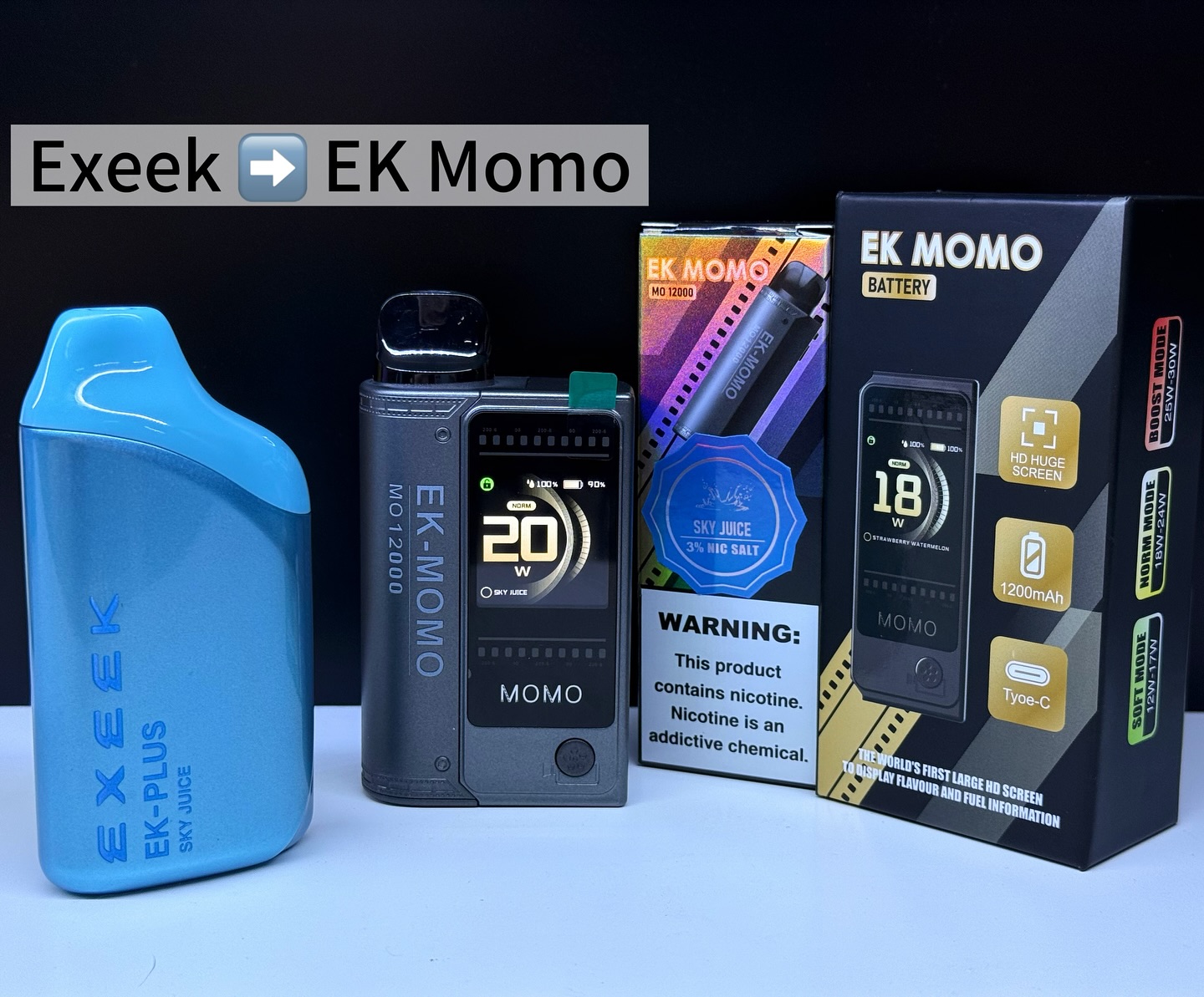 The EXEEK EK MOMO / EK 12000 is a feature-rich rechargeable disposable vape: it delivers 12,000 puffs, holds 14–16 mL of nic-salt liquid, and uses a 650 mAh USB‑C rechargeable battery. It stands out for its longevity, variety of flavours (including “MOMO” fruit lines), and convenience.